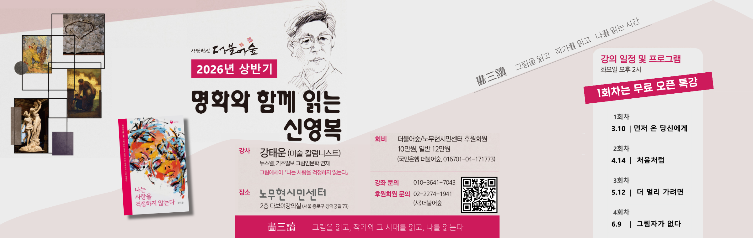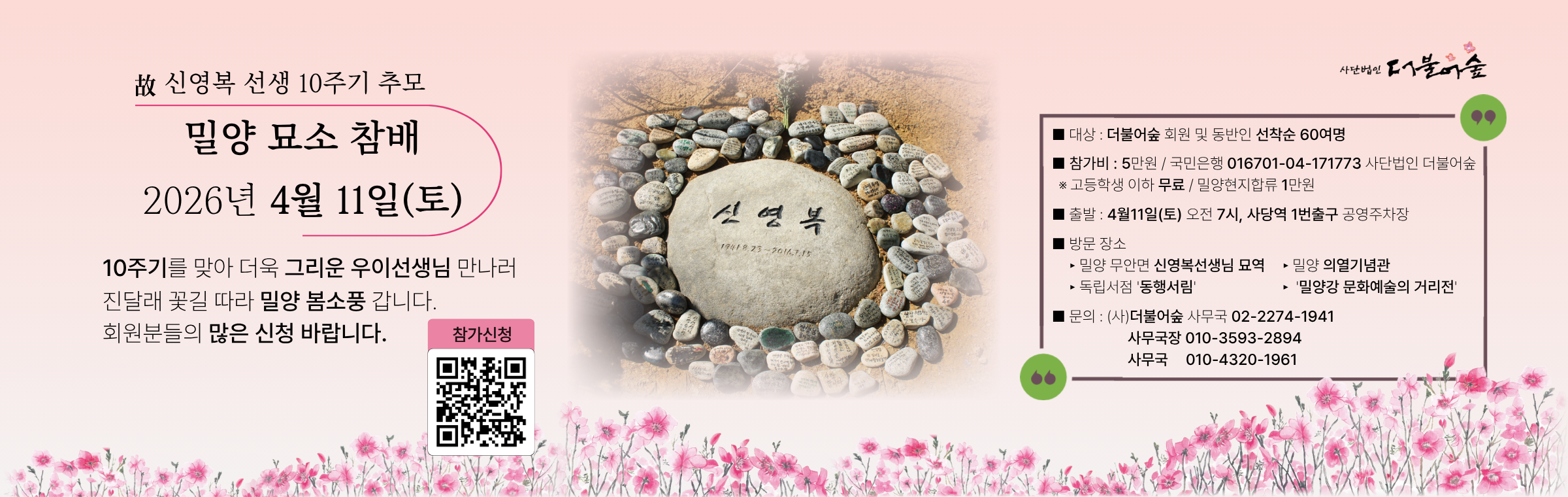 신영복선생 10주기 추모 북콘서트 안내 - 고창서점마을 토요살롱 02 신영복 선생 10주기 추모 북콘서트 "변방에서, 다시 처음처럼" 신영복 선생의 사유와 음악이 만나는 추모의 자리에 초대합니다. 이번 북콘서트는 신영복 선생 10주기를 맞아, 선생이 평생 서 있었던 ‘변방’의 자리에서 오늘의 우리에게 다시 ‘처음처럼’을 묻는 시간입니다. 신영복 선생이 남긴 말과 글, 그리고 음악이 어우러진 무대를 통해 선생의 사유와 삶의 태도를 되새기며, 지금 이 시대에 필요한 성찰과 연대의 의미를 함께 나눕니다. ■ 일시 : 2026년 04월 4일(토) 낮 3시 ■ 장소 : 고창서점마을 인문학서점 세발자전거 뒷뜰 (대산면 지석남당길 106-5) ■ 공동주최 : 고창서점마을, 돌베개, 인문학서점 세발자전거, 책마을해리 ◦참가비 : 2만원 (아메리카노 1잔 포함) ◦입금 : 국민은행 454101-01-034390 (권순엽) ◦참가신청 : https://forms.gle/YwxJdMEWH47Jkx936 ◦문의 : 010-6312-4245 *** 결재까지 완료된 신청자분들은 프로그램 2일 전까지 안내문자가 발송됩니다. *** 당일 취소 혹은 불참 시 참가비는 돌려드리지 않습니다. ■ 출연진 소개 : 더숲트리오(The Forest Trio) 더숲트리오는 학자이자 음악인인 세 명의 성공회대학교 교수(김진업, 김창남, 박경태)로 구성된 포크·어쿠스틱 밴드입니다. 삶과 연대, 평화와 성찰의 메시지를 노래하며, 신영복 선생과 함께한 여러 북콘서트 무대에 서서 따뜻한 공감과 울림을 전해 왔습니다. ★ 더불어숲 회원분들의 많은 관심과 참여를 부탁드립니다. #신영복10주기 #북콘서트 #더숲트리오 #고창서점마을 #돌베개 #인문학서점세발자전거 #책마을해리 #더불어숲 #신영복 #신영복선생님