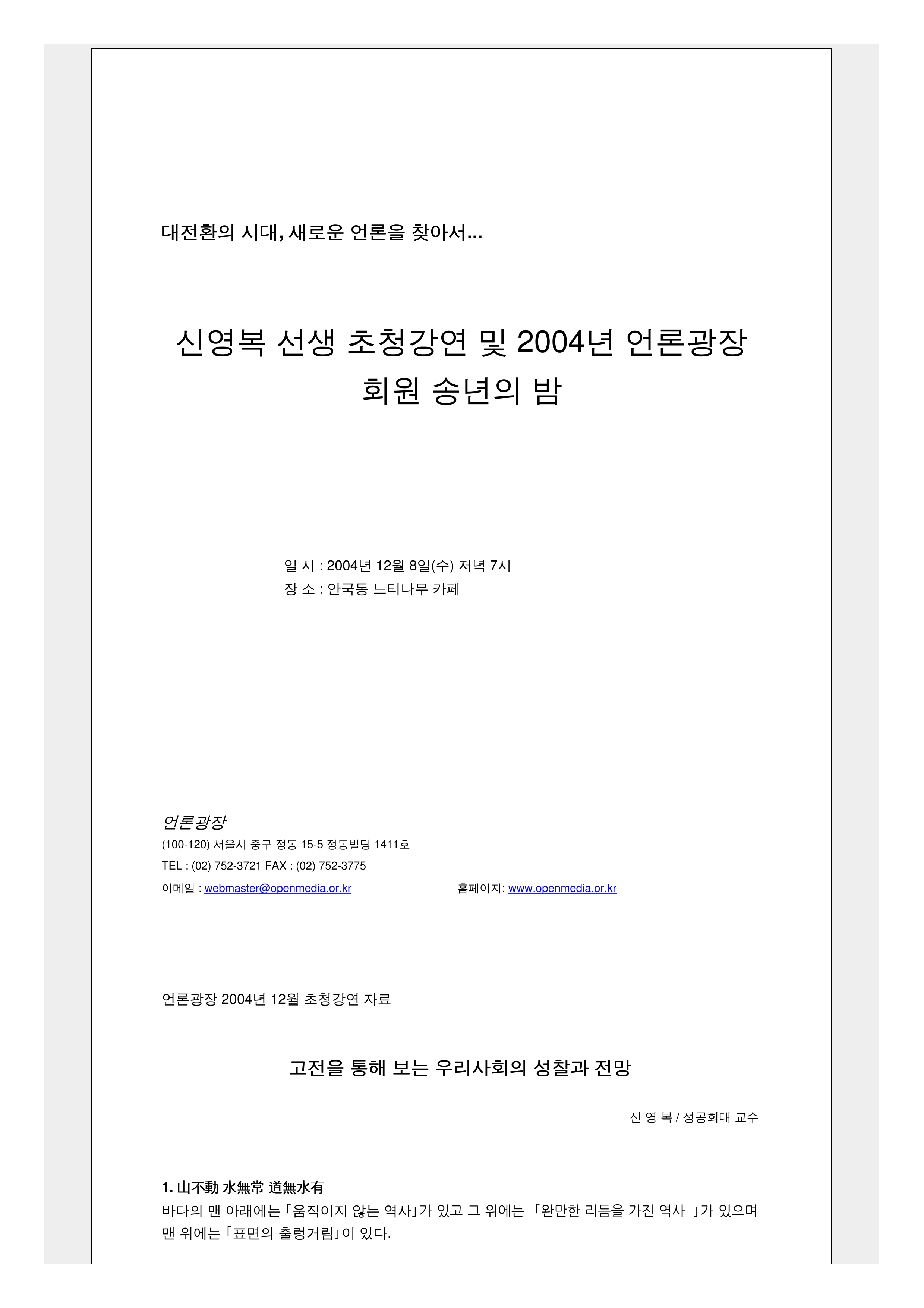 [강연] 신영복교수 올해는 한국사회 내부 성찰하는 해”"