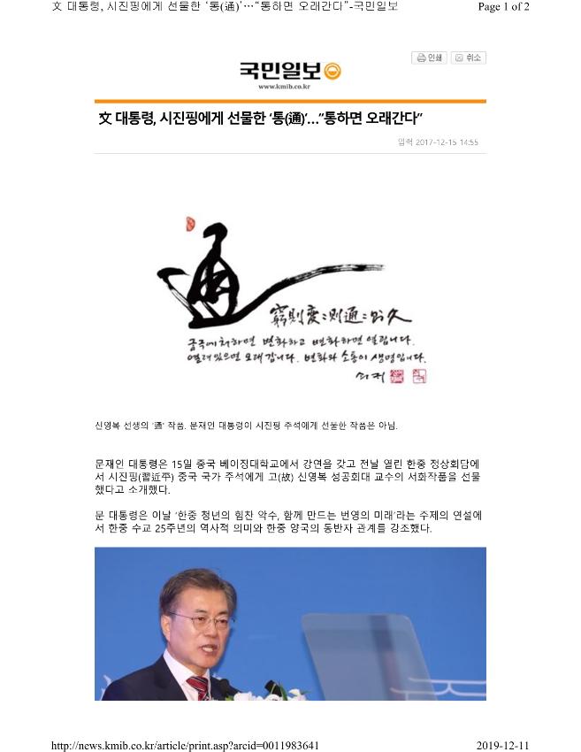문재인 대통령은 15일 중국 베이징대학교에서 강연을 갖고 전날 열린 한중 정상회담에서 시진핑(習近平) 중국 국가 주석에게 고(故) 신영복 성공회대 교수의 서화작품을 선물했다고 소개했다. 문 대통령은 이날 ‘한중 청년의 힘찬 악수, 함께 만드는 번영의 미래’라는 주제의 연설에서 한중 수교 25주년의 역사적 의미와 한중 양국의 동반자 관계를 강조했다. 강연 서두에 문 대통령은 “어제 저는 시진핑 주석에게 통(通) 이라는 글자를 선물로 드렸다”며 “궁하면 변하고, 변하면 통하고, 통하면 오래간다는 말의 ‘통’자를 딴 것이다. 저는 양 정상간, 양 국가간, 양 국민간에도 소통을 강화하는 것이 관계 개선을 하는 방법”이라고 말했다. 청와대는 시 주석에게 준 선물과 관련해 “한자 通(통)이 씌여진 신영복 선생의 서화작품”이라고 설명했다. 신영복 선생의 작품은 청와대 경내에도 걸려 있다. 문 대통령은 연설에서 북한의 핵·미사일 위협과 관련, “비단 한국만의 문제가 아니다. 북한은 중국과도 이웃하고 있으며, 북한의 핵 개발 및 이로 인한 역내 긴장 고조는 한국뿐만 아니라 중국의 평화와 발전에도 큰 위협이 되고 있다”고 지적했다. 이어 “한·중 양국은 북한의 핵 보유는 어떠한 경우에도 용인할 수 없으며, 북한의 도발을 막기 위해 강력한 제재와 압박이 필요하다는 확고한 입장을 공유하고 있다”고 덧붙였다. 또한 “한반도에서 전쟁이 재발하는 것은 결코 있어서는 안 되며 북핵문제는 궁극적으로 대화를 통해 평화적으로 해결되어야 한다는데 대해서도 깊이 공감하고 있다”며 “우리가 원하는 것은 북한과의 대립과 대결이 아니다. 북한이 올바른 선택을 하는 경우 국제사회와 함께 밝은 미래를 제공할 것”이라고 강조했다. 문 대통령은 또 “두 사람이 마음을 함께하면, 그 날카로움은 쇠를 절단할 수 있다는 ‘이인동심 기리단금(二人同心 其利斷金)’이라는 말이 있다”며 “한국과 중국이 같은 마음으로 함께 힘을 합친다면 한반도과 동북아의 평화를 이루어 내는 데 있어 그 어떤 어려움도 극복할 수 있을 것”이라고 역설했다. 문 대통령은 강연 말미에 왕안석의 시 명비곡의 한구절인 ‘인생락재 상지심(人生樂在相知心)’을 인용했다. 서로를 알아주는 것이 인생의 즐거움이란 의미다. 문 대통령은 “중국과 한국의 관계가 역지사지하며 서로를 알아주는 관계로 발전하기를 바란다”며 “나라 사이의 관계에서도 어려움은 항상 있을 수 있지만 수천 년간 이어진 한·중 교류의 역사는 양국 간의 우호와 신뢰가 결코 쉽게 흔들릴 수 없음을 증명한다”고 말했다. 또 “저는 ‘소통과 이해’를 국정 운영의 출발점으로 삼고 있다”며 “이는 나라와 나라 사이의 관계에서도 마찬가지”라고 밝혔다. 문 대통령의 이날 강연은 베이징대 교수와 교직원, 학생 300여명이 경청했다. 베이징대는 1898년 설립된 중국 최초의 국립종합대학으로 내년 개교 120주년을 맞는다. 국민일보