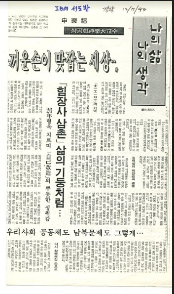 「나의 삶 나의 생각」 1993 07 12 경향신문 창백한 손 두꺼운 손이 맞잡는 세상... 신영복 성공회 神學大교수 어느 명절날이었거나 제사 때였다고 기억된다. 나는 삼촌이 건네주는 국그릇을 무심코 받다가 덴겁을 하고 그만 그릇을 떨어뜨린 기억이 있다. 삼촌은 질겁하고 있는 나를 웃는 얼굴로 바라보고 있었다. 삼촌의 손에서는 아무렇지도 않던 국그릇이 나의 손에서는 불덩이였다. 어른 손과 아이 손의 차이였다. 삼촌은 그 차이를 이용하여 어린 조카인 내게 장난을 걸었던 것이다. 삼촌이 자랑스럽게 내밀어 만져보게 한 삼촌의 손은 크고 두껍고 투박하였다. 나무껍질 같았고 땅바닥 같았다. 농사꾼이던 삼촌의 손은 다른 모든 농사꾼의 손과 마찬가지로 괭이나 호미와 같은 농기구였다. 「士一工一口寸」의 기억 내가 초등학교 2, 3학년이던 때의 일이고 보면 당시의 삼촌은 마흔을 넘긴 어른이었다. 손의 차이는 당연히 나이의 차이였다. 그러나 이 차이는 내가 그 후 삼촌의 나이가 되었을 때에도 여전히 좁힐 수 없는 차이였다. 삼촌의 모습은 세월이 흐를수록 내게는 우상처럼 문득문득 떠오른다. 언젠가 시골의 삼촌 댁에 갔을 때의 일이었다. 삼촌이 나를 뒤란으로 데리고 가서 당신의 이름을 한자로 써 보여주신 적이 있다. 그 이름 석 자는 삼촌이 쓸 수 있는 유일한 한자였는지도 모른다. 땅바닥에 써놓은 이름 석 자 중에서 가운데 자인 목숨 수(壽) 자는 획수가 많기도 하지만 앞뒤 두 자에 비하여 크기가 갑절이었다. ‘사이리하고 공이리가 구촌인기라’ 목숨 수(壽)자를 쓰시면서 입속으로 뇌이는 말이었다. 도무지 뜻을 알 수 없는 말이었다. ‘사이리하고 공이리가 구촌인기라’ 아마 서너 번은 되뇌었을 것이다. 그뿐만 아니라 노랫가락 비슷한 곡조에 실린 것이었다고 기억된다. 내가 그 말의 의미를 알게 된 것도 훨씬 훗날의 일이었음은 물론이다. 「士一工一口寸」. 그것이 복잡한 목숨 수(壽)자의 획을 기억하는 주문 같은 가락임을 알게 된 것은 참으로 훨씬 훗날의 일이었다. 나는 지금도 목숨 수(壽) 자를 쓸 때마다 어김없이 ‘사일이하고 공일리가 구촌인기라’를 중얼거리는 버릇이 있다. 그리고 어린 조카에게 당신도 한문을 쓸 수 있음을 알리려 했던 삼촌의 마음이 40여 년이 흐른 지금도 뭉클한 아픔으로 다가온다. 소위 독서계급에 속해버린 나를 각성케 하는 꾸중처럼. 징역살이를 하고 있을 때의 일이다. 징역 살자면 더러 험한 일을 하지 않을 수도 없기 때문에 당연히 손이 거칠고 투박해진다. 뿐만 아니라 몇 년을 계속 구둣일을 하던 때에는 손가락과 손바닥에 제법 넓게 굳은살이 박힌 적이 있었다. 손바닥을 비비면 다른 소리가 났다. 옛날의 삼촌 손만은 못하지만, 결코 창백한 흰 손은 아니었다. 창백한 인텔리의 손을 결별하고 이제 자기의 사회성분을 개조해 낸 이른바 자기변혁의 뿌듯한 성취감은 실로 대단한 것이었다. 삼촌의 두꺼운 손과 그 덴겁했던 국그릇이 생각났다. 그리고 내가 그때의 삼촌이 되고 싶었고 또 된 듯도 하였다. 징역 살며 하얀 손과 결별 교도소의 식사대형은 각 공장의 사정에 따라 조금씩 다르기는 하지만 대개는 먹자골목의 좌판 같은 긴 식탁에 마주 보고 앉는 2열 또는 4열의 긴 횡대이다. 그래서 저쪽 끝에서 보내주는 밥그릇이나 국그릇을 위로 위로 건네준다. 대개는 좌판 위로 밀어서 전달한다. 어쩌다 소기름국 같이 뜨거운 국이 나오는 때, 나는 옆 사람을 덴겁시키는 작은 장난을 한다. 이를테면 시침 뚝 떼고 아무렇지도 않은 얼굴로 그 뜨거운 알루미늄 국식기를 옆 사람에게 건넨다. 옆 사람은 무심결에 받다가 아 뜨거라 소스라치게 놀라는 것이다. 경우에 따라서는 엉뚱한 이야기를 걸면서 건네기도 한다. 이러한 장난은 모처럼 기름국을 먹게 되는 행복(?)한 식탁에 어울리는 장난이기도 하다. 나는 뜨거워 혼겁을 하고 있는 옆 친구를 40년 전 삼촌의 얼굴이 되어 바라본다. 실은 나도 뜨거운 국 식기를 참느라고 속으로 안간힘을 쓰는 것이 사실이다. 그러나 나는 평소에 수시로 손을 단련시키기도 하였다. 난로 연통이나 작업용 인두 같은 것으로 틈틈이 연마해 왔던 것이다. 이러한 장난은 물론 그야말로 한낱 장난에 지나지 않는 것이다. 그러나 그 부질없는 장난 속에는 옛날의 그 득의 연한 삼촌의 웃음을 내 것으로 갖고 싶은 나의 그리움이 깔려있었는지도 모른다. 그리고 그것은 다만 손의 이야기가 아니라 창백한 인테리의 손을 결별하는 자기개조의 간고한 노력의 일단이면서 동시에 두꺼운 손, 건강한 삶을 향한 그리움과 발돋움이었는지도 모른다. 사실 삼촌은 나에게 당신의 한자 실력을 과시하지 않더라도 아무 상관이 없었다. 삼촌은 그의 건장하고 당당한 체력만으로도 내게는 이미 흠모와 존경의 대상이었다. 고향마을에는 당나무 밑 넓은 마당에 언제부터인지 전해 내려오는 큼직한 돌이 하나 굴러다니고 있었다. 정확한 무게는 알 수 없지만 아마 1백kg은 더 나가는 돌이었다고 생각된다. 계란처럼 양쪽이 빠지고 가운데가 부른 차돌이었다. 마을의 모든 사내아이들은 자라 청년이 되면서 누구나 이 돌을 들어보는 것이다. 이 돌