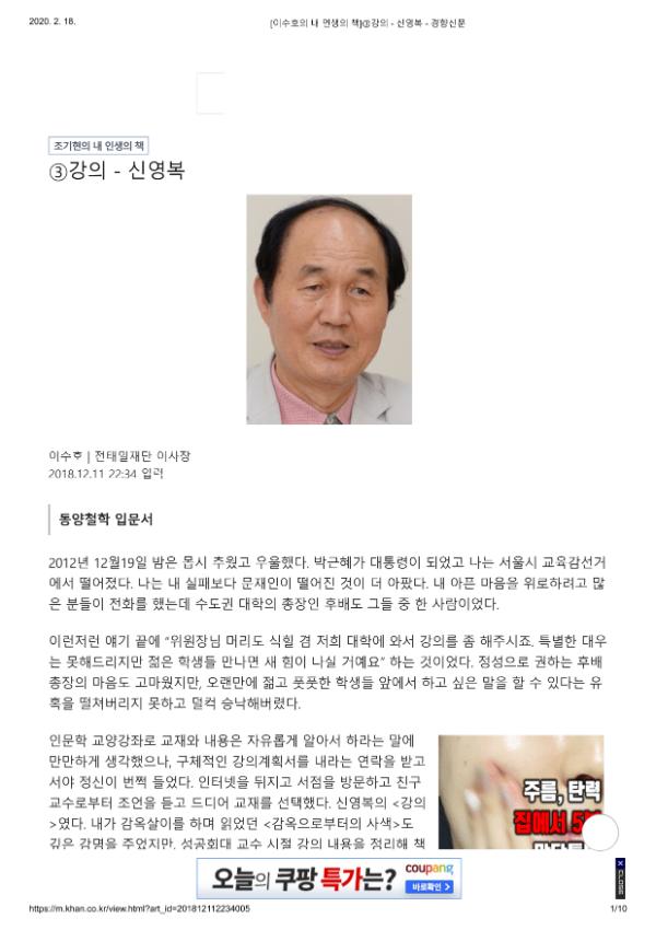 경향신문 ③강의 - 신영복 [이수호의 내 인생의 책] 이수호 | 전태일재단 이사장 입력 2018.12.11. 22:40 수정 2018.12.11. 22:53 2012년 12월19일 밤은 몹시 추웠고 우울했다. 박근혜가 대통령이 되었고 나는 서울시 교육감선거에서 떨어졌다. 나는 내 실패보다 문재인이 떨어진 것이 더 아팠다. 내 아픈 마음을 위로하려고 많은 분들이 전화를 했는데 수도권 대학의 총장인 후배도 그들 중 한 사람이었다. 이런저런 얘기 끝에 “위원장님 머리도 식힐 겸 저희 대학에 와서 강의를 좀 해주시죠. 특별한 대우는 못해드리지만 젊은 학생들 만나면 새 힘이 나실 거예요” 하는 것이었다. 정성으로 권하는 후배 총장의 마음도 고마웠지만, 오랜만에 젊고 풋풋한 학생들 앞에서 하고 싶은 말을 할 수 있다는 유혹을 떨쳐버리지 못하고 덜컥 승낙해버렸다. 인문학 교양강좌로 교재와 내용은 자유롭게 알아서 하라는 말에 만만하게 생각했으나, 구체적인 강의계획서를 내라는 연락을 받고서야 정신이 번쩍 들었다. 인터넷을 뒤지고 서점을 방문하고 친구 교수로부터 조언을 듣고 드디어 교재를 선택했다. 신영복의 <강의>였다. 내가 감옥살이를 하며 읽었던 <감옥으로부터의 사색>도 깊은 감명을 주었지만, 성공회대 교수 시절 강의 내용을 정리해 책으로 출판한 <강의>는 따라 읽으면 저절로 공부가 되는 아주 좋은 동양철학 입문서였다. 내가 나름대로 알고 있었던 고전에 대한 새로운 관점이 좋았다. 나는 이 책을 가지고 젊은 친구들과 같이 읽으며 시경·서경은 말할 것도 없고 논어·맹자·노자·장자를 다시 만나고, 묵자·순자·한비자를 새롭게 알게 됐다. 다양한 예시 문장을 통해 관계론적 사고를 재조명할 수 있도록 구성한 내용은, 거칠어진 내 마음밭에 촉촉이 내리는 단비와 같았다. 대학 강의는 1년 만에 끝났지만 신영복의 <강의>는 내 인생의 길잡이가 되어 언제나 내 마음속에 있다. 이수호 | 전태일재단 이사장