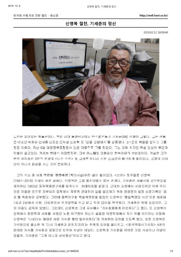 노인은 살아있는 박물관이다. 특히 재야 동양학자이자 민주화운동가 기세춘(84) 선생이 그렇다. 그는 전봉준·이승만·박정희·김대중·신동엽·문익환·신영복 등 ‘인물 근현대사’를 관통했다. 3·1운동 백돌을 앞두고 그를 찾은 이유다. 지난 8일 대전정부종합청사 인근 아파트로 그를 찾았다. 그는 치매 초기인 두살 연상의 부인과 단둘이 살고있다. 거처는 현대식 아파트지만, 그는 어느때와 다름없이 한복차림의 선비풍이다. 거실엔 그가 번역 작업중인 3천쪽 분량의 <다산 주역> 등 고서뿐 아니라 신문 스크랩이 빼곡하게 쌓여있다. 공맹의 시대만이 아니라 현실을 사는 것이 분명하다. 그의 숙소 겸 서재 벽면에 ‘學而時習’(학이시습)이란 글이 붙어있다. <논어> 첫구절로 신영복(1941~2016) 선생이 써준 글씨다. 신영복은 그와 뗄레야뗄수 없는 관계다. 기세춘은 서울시청 공무원으로 재직하던 1963년 동학혁명연구회를 발족시켜 초대회장을 맡았다. 근대화 과정에서 서양것에만 미쳐 우리것은 저열한 것으로 치부되자 동학에서 자주적 근대화의 길을 발견하기 위해 전봉준의 법정 심문기록인 ‘공초’를 독회하며 공부했다. 그런데 동학연구회 학술위원장을 맡았던 신영복이 ‘통일혁명당 사건’으로 체포돼 1심과 2심에서 사형, 대법원에서 무기징역을 선고 받고 무려 22년을 복역했다. 기세춘은 밖에 있었지만, 그의 마음도 감옥에 있었다. 그런데도 신영복의 그의 저서에서 “기세춘형에게 미안하다”고 했다. 또 신영복이 감옥에서 한문학과 서예를 배웠던 노촌 이구영이 자신이 설립한 이문학회에서 자기 뒤를 이으라는 요청에 신영복은 “나보다는 제대로 배운 기세춘 형이 맡아야한다”며 기세춘이 강연을 잇도록 했다. 또한 신영복은 가석방으로 출소한 뒤 ‘다시 기세춘과 얽히지마라’는 주위의 강권을 물리치고, <중국역대시가선집> 4권의 방대한 저서를 기세춘과 공동으로 번역해 세상에 내놨다. 신영복과 기세춘을 이어준 것은 사상이나 이념이었을까. 기세춘은 “그게 아니라 선비정신”이라고 한다. 기세춘글-.jpg » 기세춘 선생은 <주역>의 대가이지만, 방문에 "점 칠 필요 없다. 오직 시대 소명에 따르면 된다"는 내용의 글을 써놓았다. 기세춘은 고봉 기대승의 15대손이다. 고봉은 아버지벌인 퇴계 이황과 조선 성리학의 최고 논쟁인 사단칠정논쟁을 8년간 이끌었던 유학자였다. 기세춘의 큰할아버지는 구한말 호남의병대장이던 기삼연이다. 그의 조부인 기삼연의 동생 기동우는 전남 장성에서 전북 정읍 북면으로 이주해 서당 훈장을 했다. 그 때 정읍 이평면에선 전봉준이 서당 훈장을 했고, 강일순도 그 일대에서 서당 훈장을 했다고 한다. 그 때 정읍은 고부군 소속이었는데, 고부군수가 탐관오리 조병갑이었다. 당시는 서당이 정보 소통 창구여서 그곳에서 혁명의 기운이 모아졌다고 한다. 기세춘도 어려서부터 서당학동이었고, 10세에 사서삼경의 최후의 경전인 <주역>을 뗐다. 그러나 이땅의 현대사는 그를 유학도로서 외길을 걷게 두지않았다. 일제시대 많은 지식인들처럼 그의 부친도 좌익활동을 했다. 의병장 조상과 부친의 영향으로 그는 전주사범고 재학 때부터 친일파와 손잡은 이승만을 타도하자는 의혈동지회를 결성할 정도로 일찍부터 ‘저항’의 길로 들어섰다. 그런데 첫 교사부임지가 박정희와 김재규의 고향인 경북 선산이어서 그들의 인척들과 인연을 맺었다. 그로 인해 육영수로부터 ‘성심여고에 다니는 딸(박근혜)의 결벽증을 어찌해야하느냐’는 자문을 받기도 했다. 그가 서울교육청을 거쳐 종로도서관에서 근무할때는 민주당 부대변인이던 김대중에게 당시 ‘금서’들을 몰래 대출해주는 창구 구실을 했다. 또 전주사범 선배이자 <껍데기는 가라>의 시인 신동엽이 편집주간으로 있던 <교육평론>잡지에 취재부장으로 일하며 ‘일제의 아류 교육’을 비판하기도 했고, 사월혁명연구회를 창립해 혁명정신을 이어가는데 앞장섰다. 인물만이 아니라 접한 종교도 다양했다. 유학도로 출발했지만, 독실한 그리스도인이었던 할머니를 위해 부친이 마을에 세운 교회에 다녔고, 젊은시절엔 한때 입산에 산사에서 지내기도 했다. 이렇게 다양한 종교 사상 이념을 거쳐오면서 그는 “모든 종교와 경전과 인문학이 말하는 것은 하나”라고 한다. ‘서로 사이 좋게 살자는 것 아니냐’는 것이다. 누구도 소외시키지않은 공동체성이 최고의 가르침이라는 것이다. 전봉준집-.JPG » 동학혁명연구회를 창립한 기세춘이 고향 전북 정읍에 있는 전봉준 생가를 찾았을 때 모습이다. 그는 뼈속부터 저항가의 기질을 타고났다. 그러나 아픈 개인사와 역사들이 공동체성을 일깨워준 것 아니냐고 말한다. ‘현대사에서 좌건 우건 어느 누구도 아프지 않은 사람이 있었느냐’는 것이다. 그는 이승만의 친위대에 의해 두들겨맞은 좌익 부친의 아픔만 본것이 아니다. 한의사였던 외삼촌은 그 좌익들의 즉결처분으로 죽었다. 또 그의 큰누나는 위안부가 되지않으려 간도로 피신했다가 해방뒤 귀국하던 중 폭격으로 남편을 잃고, 순천에서 경찰을 만나 개가했으니 그도 여순사건으로 잃는 연속적인 비운을 