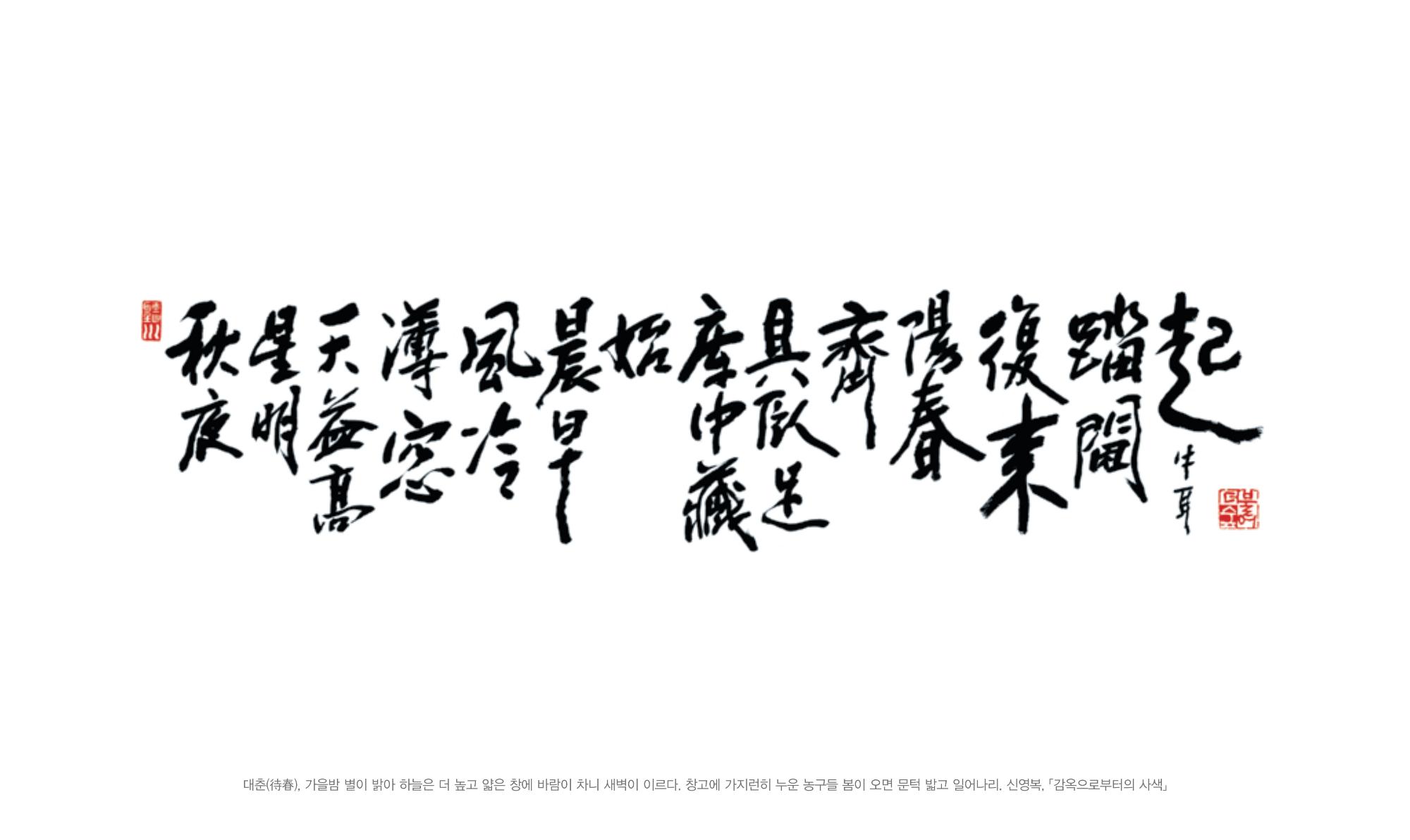 가을밤 별이 밝아 하늘은 더 높고 얇은 창에 바람이 차니 새벽이 이르다. 창고에 가지런히 누운 농부들 봄이 오면 문턱 밟고 일어나리. 신영복 "감옥으로부터의 사색"