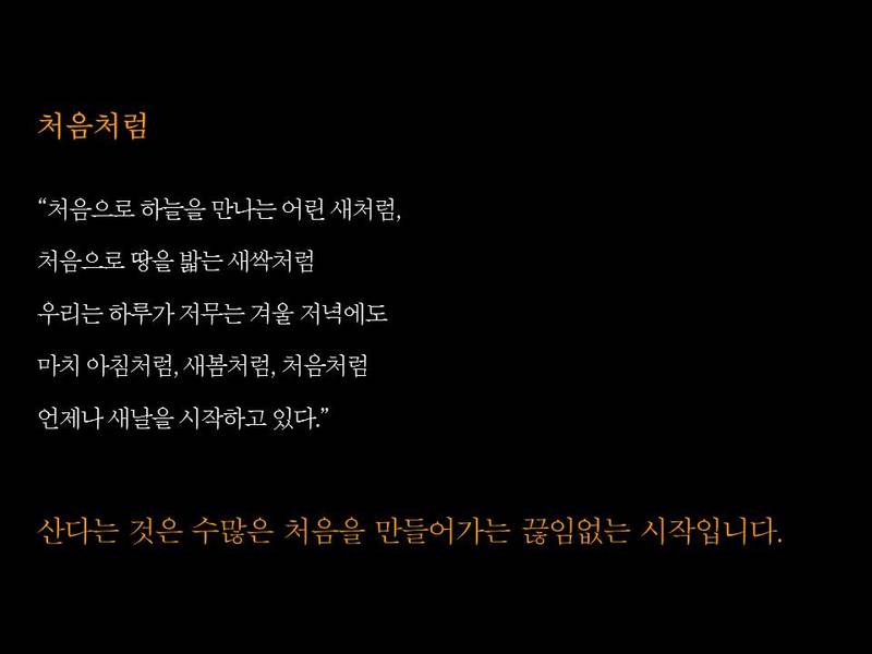 처음으로 하늘을 만나는 어린 새처럼, 처음으로 땅을 밟는 새싹처럼 우리는 하루가 저무는 겨울 저녁에도 마치 아침처럼, 새봄처럼, 처음처럼 언제나 새날을 시작하고 있다. 돌베개