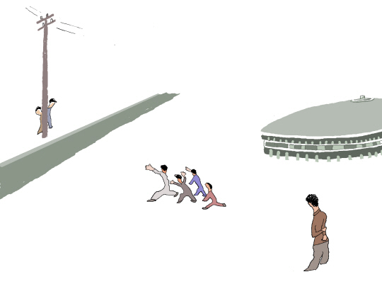 과연 길 저편의 전봇대 뒤에 꼬마 둘이 서 있었다. 우리들의 시선이 그들에게로 쏠리자 그 두 명의 꼬마는 무슨 잘못이라도 저지른 사람같이 전봇대 뒤로 몸을 숨기고 있는 것이 아닌가. 나는 그 두 명의 아이가 틀림없이 '좋은 아이'라고 생각했다. 전봇대 뒤에 숨어서 기다리고 있는 그들의 마음씨야말로 딱할 정도로 착한 것이 아닐 수 없다. As expected, two kids were standing behind the pole by the side of the road. All eyes turned upon them and found that they were hiding behind the pole as if they did something wrong. I thought that the two kids were 'good guys' for sure. They were indeed 'pitifully' good enough to wait, hiding themselves behind the pole, being shy. 전봇대 뒤에 있는 두 명의 신입회원을 이리로 데려오기 위하여 4명의 꼬마가 모두 달려갔다. 내가 이 두 명의 꼬마와 악수를 하고 나자 그제야 이 두 명에 대한 칭찬과 자랑을 늘어놓기 시작하는 것이다. All four kids ran to bring the two new members over. Only after I shook hands with the two, did the four begin to go through a list of their virtues and compliments.