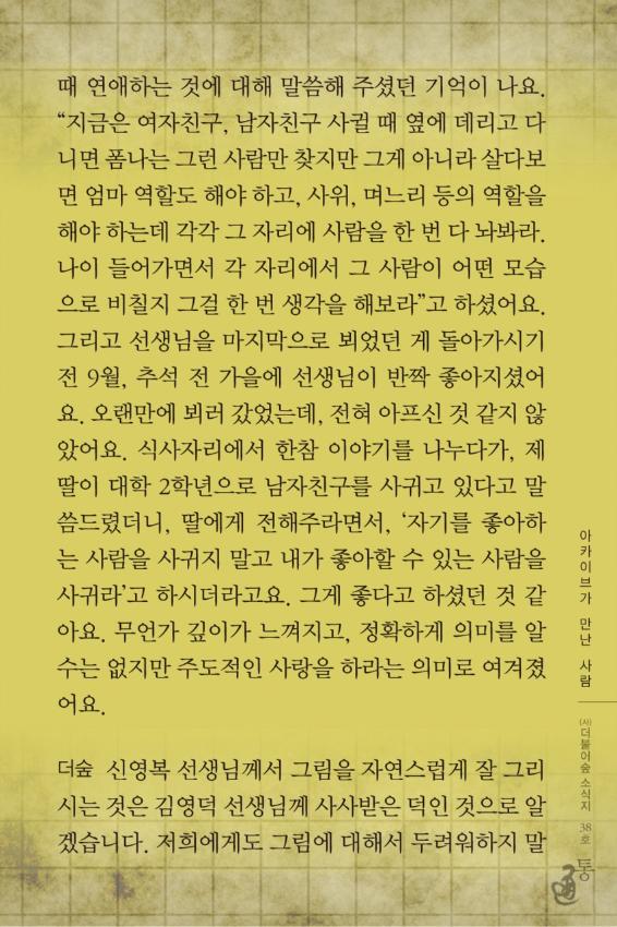 그리고 선생님을 마지막으로 뵈었던 게 돌아가시기 전 9월, 추석 전 가을에 선생님이 반짝 좋아지셨어요. 오랜만에 뵈러 갔었는데, 전혀 아프신 것 같지 않았어요. 식사자리에서 한참 이야기를 나누다가, 제 딸이 대학 2학년으로 남자친구를 사귀고 있다고 말씀드렸더니, 딸에게 전해주라면서, ‘자기를 좋아하는 사람을 사귀지 말고 내가 좋아할 수 있는 사람을 사귀라’고 하시더라고요. 그게 좋다고 하셨던 것 같아요. 무언가 깊이가 느껴지고, 정확하게 의미를 알 수는 없지만 주도적인 사랑을 하라는 의미로 여겨졌어요.