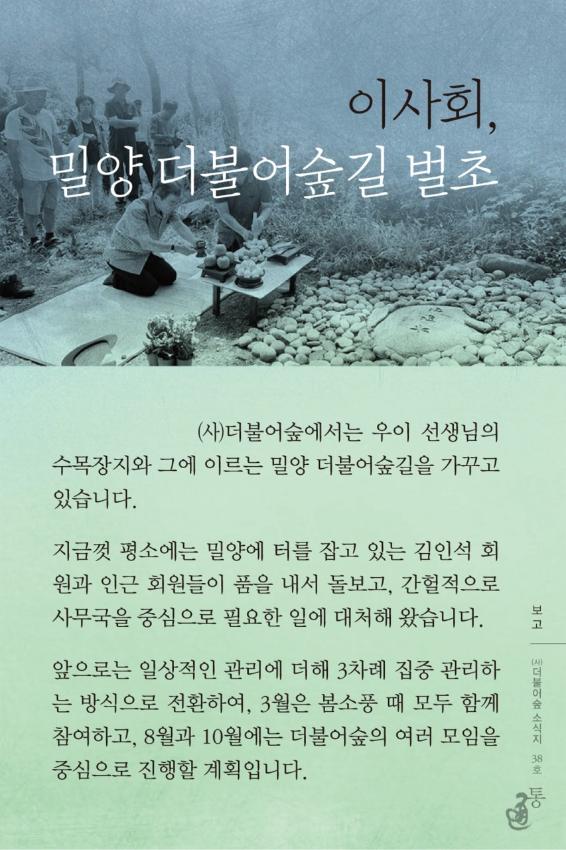 (사)더불어숲에서는 우이 선생님의 수목장지와 그에 이르는 밀양 더불어숲길을 가꾸고 있습니다.