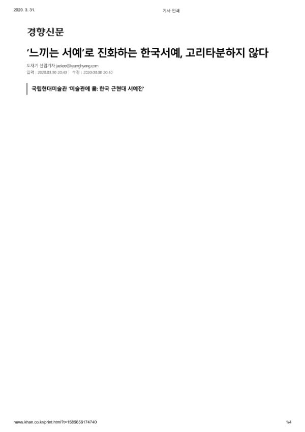 전시와 연계해 출간된 도록은 풍성한 논고·서예비평 등으로 서예 애호가들에게 귀중한 자료가 될 만하다. 국립현대미술관은 4월5일까지 휴관하며, 코로나19 상황에 따라 덕수궁관 전시장의 문을 열 계획이다.