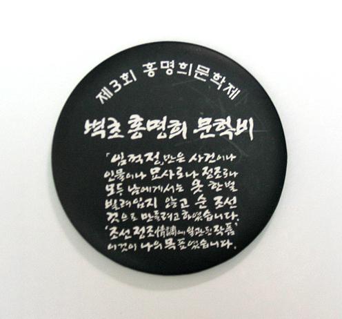 벽초 홍명희 문학비「임꺽정」만은 사건이나 인물이나 묘사로나 정조로나모두 남에게서는 옷 한벌 빌려입지 않고순 조선 것으로 만들려고 하였습니다.조선 정조情調에 일관된 작품이것이 나의 목표였습니다.