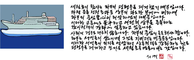 본문 : 세월호의 참사는 하부의 평형수를 제거했기 때문입니다. 과적 증축 정원초과 등 상부의 과도한 무게에 비하여 하부의 중심重心이 허약하였기 때문입니다. 이러한 교훈에도 불구하고 여전히 상부를 증축하는 감시권력의 강화에 열중하고 있습니다. 사회의 경우도 다르지 않습니다. 하부의 중심이 든든해야 합니다. 하부는 서민들의 삶이며 그것을 지키려는 민중운동입니다. 이러한 서민들의 의지를 억압하고 삼층권력을 강화하는 것은 평형수를 제거하고 또다른 세월호를 만들어 내는 것입니다.