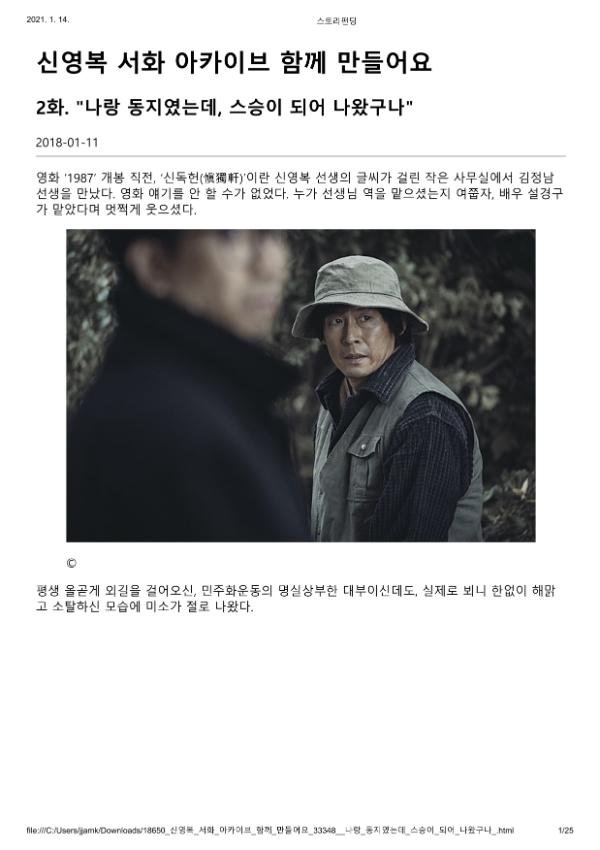 영화 ‘1987’ 개봉 직전, ‘신독헌(愼獨軒)’이란 신영복 선생의 글씨가 걸린 작은 사무실에서 김정남 선생을 만났다. 영화 얘기를 안 할 수가 없었다. 누가 선생님 역을 맡으셨는지 여쭙자, 배우 설경구가 맡았다며 멋쩍게 웃으셨다.