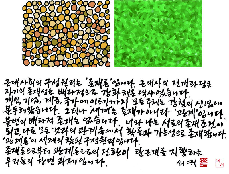 본문 : 근대사회의 구성원리는 '존재론'입니다. 근대사의 전개과정은 자기의 존재성을 배타적으로 강화해온 역사였습니다. 개인, 기업, 계급, 국가에 이르기까지 모든 주체는 강철의 신념에 몰두해왔습니다. 그러나 '세계'는 존재가 아니라 '관계'입니다. 불변의 배타적 존재는 없습니다. 너와 나는 서로의 존재조건이 되고, 다른 모든 것과의 관계속에서 확률과 가능성으로 존재합니다. '관계론'이 세계의 참된 구성원리입니다. 존재론으로부터 관계론으로의 전환이 탈근대를 지향하는 우리들의 당면과제입니다.