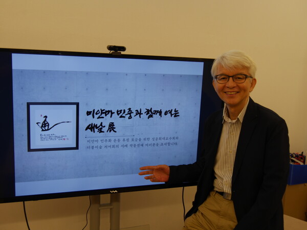 미얀마 민주화운동 후원 기금 마련을 위해 이번 전시회를 마련한 더불어숲 이사장인 김창남(61) 성공회대 신문방송학과 교수를 17일 서울 성북동 더불어숲 사무실에서 만났다.