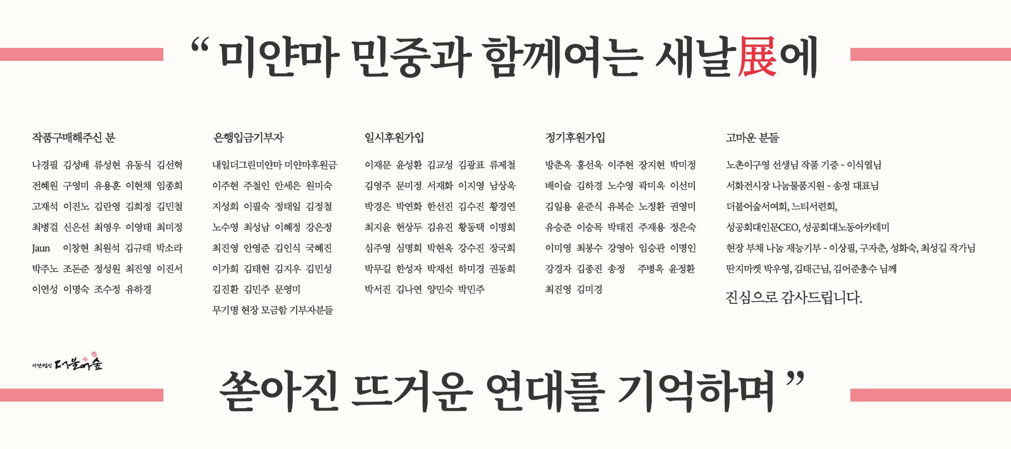 (사)더불어숲이 주관한 “미얀마 민중과 함께 여는 새날 展”이 많은 분들의 적극적인 호응 속에 마무리되었습니다. 서예작품을 구매해 주신 분들, 전시회 현장에서 기부해 주신 분들, 기부금을 송금해 주신 분들, 전시장을 방문해 뜻을 나누어 주신 분들 모두에게 깊은 감사를 드립니다.