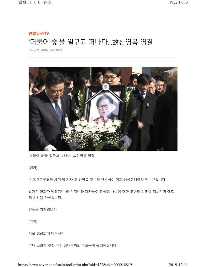 신영복 석좌교수의 영결식이 어제 오전 서울 구로구 성공회대 대학성당에서 학교장으로 엄수됐습니다. 유족과 지인, 일반 시민 등 1천여명이 찾은 영결식은 방송인 김제동씨의 사회로 진행됐고 이재정 경기도교육감이 조사를 낭독했습니다. 이 교육감은 조사에서 “역사의 한가운데서 싸운 고인은 깊은 성찰로 고난을 넘어 절망이 아닌 희망, 단절이 아닌 연대, 분노가 아닌 깨달음을 보여줬다”고 평가했습니다. 2014년 희귀 피부암 진단을 받아 투병생활을 이어가던 신 교수는 지난 15일 자택에서 숨을 거뒀습니다. ------------------------------------------------------------------------------------------------------------------------------ ‘더불어 숲’을 일구고 떠나다…故신영복 영결 [앵커] ‘감옥으로부터의 사색’의 저자 고 신영복 교수의 영결식이 어제 성공회대에서 엄수됐습니다. 갑자기 한파가 닥쳤지만 많은 지인과 제자들이 참석해 사람에 대한 고인의 성찰을 되새기며 애도의 시간을 가졌습니다. 김동욱 기자입니다. [기자] 서울 성공회대 대학성당. 기타 소리에 맞춰 가수 정태춘씨의 추모곡이 울려퍼집니다. <현장음> “저기 떠나가는 배, 거친바다 외로이 겨울비에 젖은…” 고 신영복 교수의 영결식이 가족과 지인, 제자 등 천여명이 참석한 가운데 엄수됐습니다. 참석자들은 시대의 스승이라며 고인을 애도했습니다. <이재정 / 경기도교육감> “선생님 정녕 먼 길을 떠나셔야겠습니까. 아직도 그 나무들은 숲을 이루지 못하였는데, 어찌 선생님은 그냥 떠나시려 하십니까.” 참석자들은 굴곡진 여정 속에서도 깊은 성찰, 사람과 삶의 소중함을 일깨워준 고인의 뜻을 다시 한번 되새겼습니다. 25년간 후학들을 가르쳐온 교정 곳곳에는 고인을 추모하는 수백여장의 엽서가 마지막 길을 배웅했습니다. 신 교수는 피부암 진단을 받고 투병중 암이 전이되면서 지난 15일 숨을 거뒀습니다. 신 교수의 시신은 벽제 시립 승화원으로 옮겨져 화장됐습니다. 연합뉴스TV